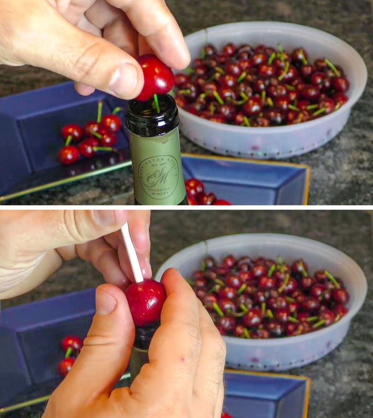 Щоб жодна кісточка не затьмарила ягідну трапезу, можна протестувати легкий спосіб позбавлення від них. Для цього озбройтеся пляшкою з вузьким горлечком і тонкою паличкою. Покрокові рекомендації — тут.