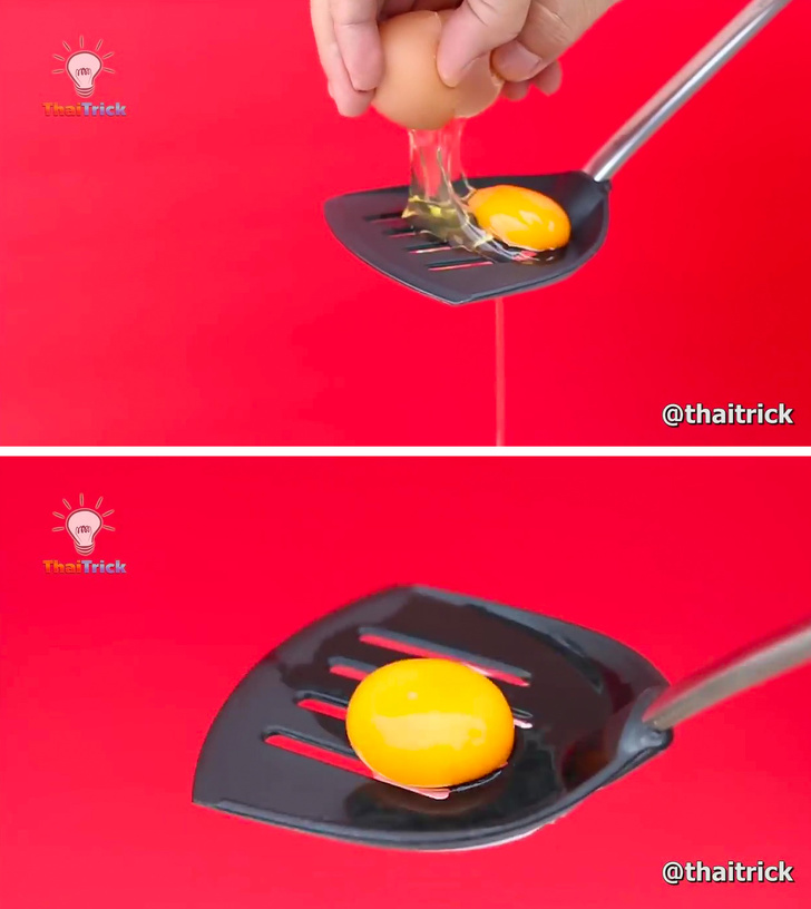 Як відокремити жовток від білка за допомогою порожньої пластикової пляшки, знають, здається, всі. Але є спосіб простіше. Вам знадобляться звичайна лопатка з отворами (можна замінити ложкою з дірками) і ємність для білків. Наочно показаний процес на відео.