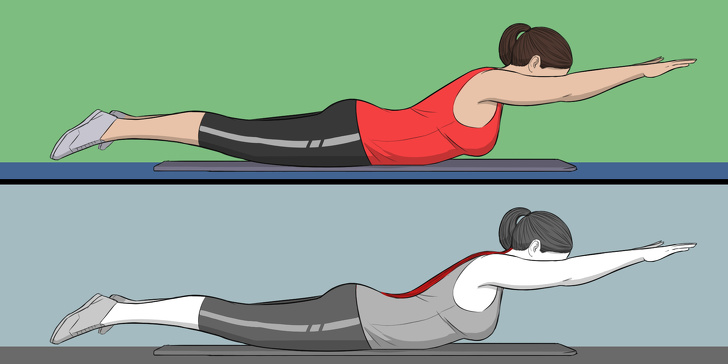 - Ляжте на килимок обличчям вниз, витягніть руки перед собою. Синхронно підніміть руки і ноги на відстань близько 15 см від підлоги.