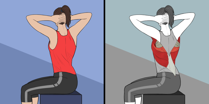 Розтяжка в положенні сидячи працює на найширший м'яз спини, прес і м'язи ніг.