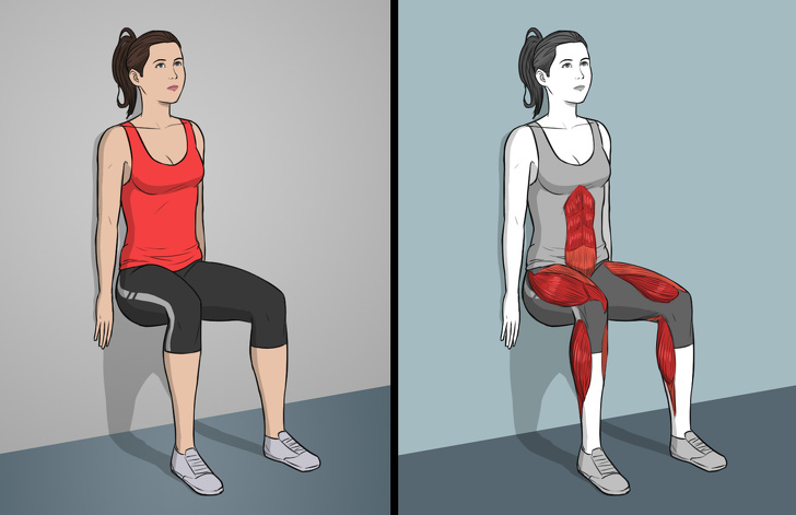 - Виконується у стіни. Встаньте спиною впритул до стіни й повільно ковзаєте вниз, поки коліна не будуть зігнуті під кутом 90° або близько до того.