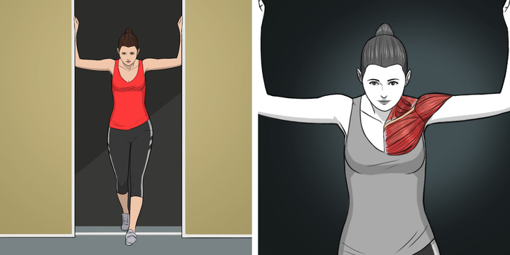- Виконується в дверному отворі. Розташуйте руки на рамі дверей, причому так, щоб кут в ліктьовому згині становив 90°. Кут між плечем і тілом теж повинен бути прямим.