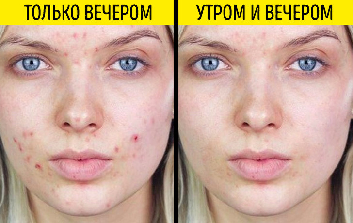 Очищаючі засоби принесуть куди більшу користь шкірі, якщо їх використовувати не тільки ввечері, для зняття макіяжу, але і вранці. Так ми змиємо себум, ороговілі частинки шкіри, піт і забруднення, які потрапили в шкіру з наволочки за ніч. Також краще повністю відмовитися від скрабів на користь засобів для вмивання і щадних засобів з кислотами, так як агресивне очищення завдає шкірі травми.