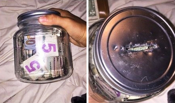 9. Нетерплячим людям, які не вміють збирати гроші, може допомогти декоративна банку і суперклей: приклеюємо кришку до банку, проробляємо в ній «купюроприймач» — і готово