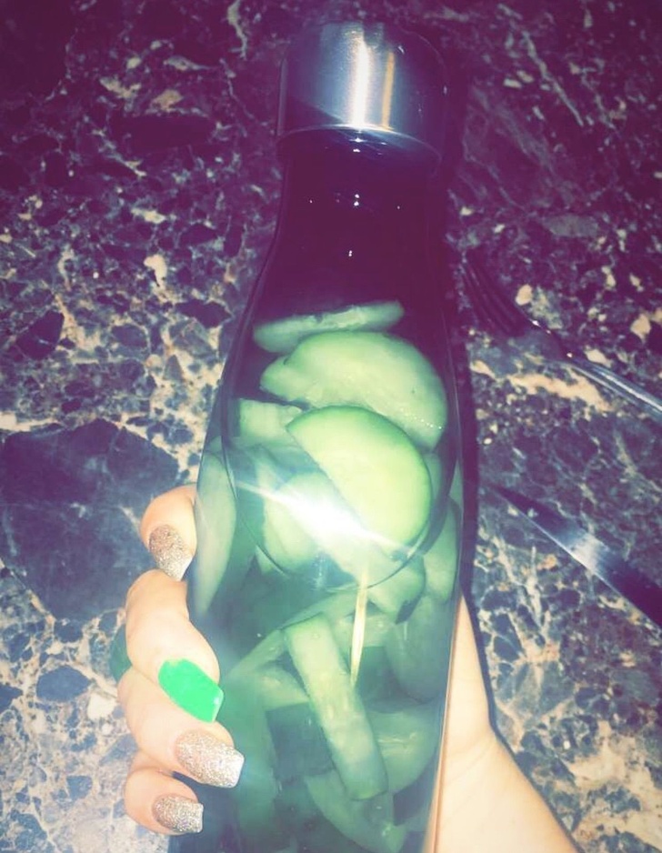 8. У випадку, якщо ви не знали: вода з огірками, настояна протягом ночі, — прекрасний засіб від акне, компенсаційна шкіру і робить її сяючою. І для травлення непогано — випивайте пляшечку протягом дня і буде вам щастя