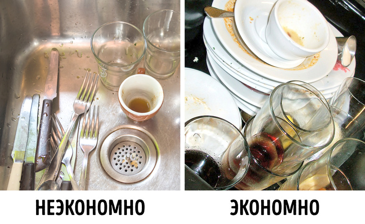 З точки зору економії і екології брудний посуд краще збирати і замочувати. Якщо мити відразу повну раковину посуду, води витече менше, ніж при митті кожної тарілки окремо. Тільки тарілку від гречки потрібно мити відразу.
