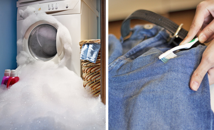 Джинси перуть після 4-5 носок, вивернувши навиворіт і застебнувши всі блискавки і гудзики, щоб бовтаються металеві деталі не шкодили барабана пральної машини. А між стирками можна зачищати невеликі забруднення з допомогою зубної щітки.