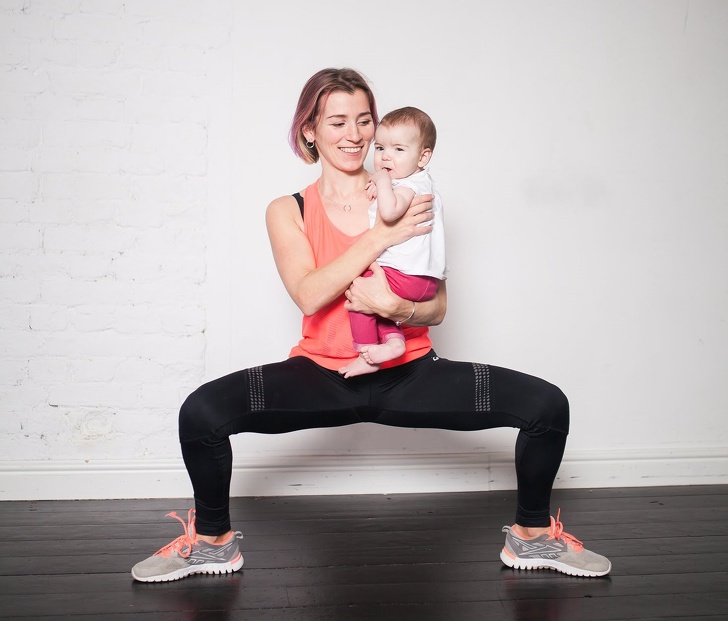 Тримайте дитину на руках перед собою. Стійте, розставивши ноги на ширині плечей. Присідайте, опускаючись як можна нижче, і тримаючи коліна над щиколотками. Поверніться у вихідне положення.