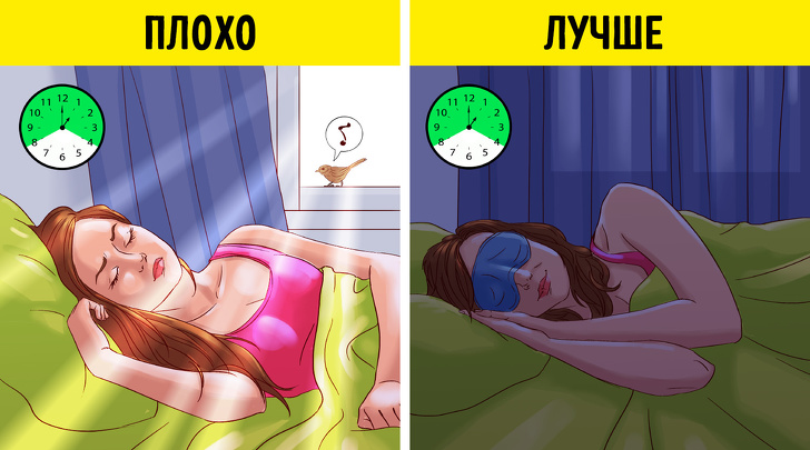 - Максимальна затемненность і тиша будинку: купіть штори, які не пропускають денне світло, або одягайте маску для сну, використовуйте беруші.