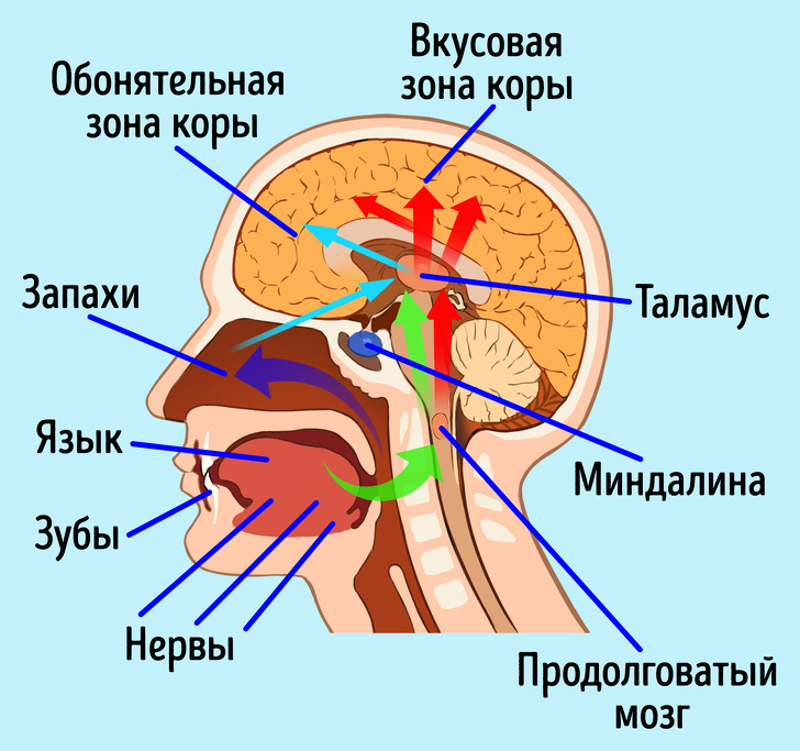 На малюнку: процес розпізнавання смаку. Інформація від смакових, термічних, нюхових рецепторів і дані від механічних датчиків зубів і жувальних м'язів надходить по нервових волокнах у мозок. Так ми за частки секунди розуміємо, що їмо.