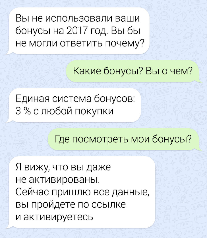 Схема шахраїв зводиться до того, щоб перенаправити вас на фейковий сайт. В даному випадку представитися по телефону вони можуть співробітником магазину або, як було в деяких конкретних випадках, фахівцем «Єдиної системи бонусів» (треба розуміти, що такої організації, не прив'язаної до конкретних компаній, в принципі не існує). Злочинець повідомляє, що ви накопичили знижкові бали, але чомусь не витратили їх. Поки ви зрозумієте, про яких магазинах і знижки йде мова, з'ясується, що ваш акаунт взагалі не активований в системі. І тут же знайдеться рішення: зловмисник запропонує надіслати посилання на сайт, де вам потрібно буде ввести особисті дані. Сайт, звичайно, належить шахраям, при цьому може виглядати точно так само, як сайт відомого інтернет-магазину (уважно дивіться на адресу сторінки).