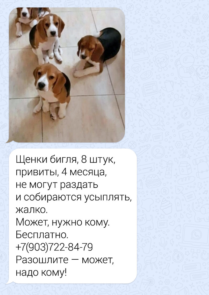Вже не перший рік по інтернету гуляють повідомлення про те, що в якомусь притулку або військової частини збираються приспати тварин. А поки цього не сталося, можна зателефонувати за вказаним номером і домовитися про те, щоб забрати звіра до себе. Бажаючих врятувати собаку від несправедливої смерті маса, а ті, хто не може собі цього дозволити, охоче поширюють інформацію серед друзів. У цьому і є унікальність схеми, тим більше що повідомленнями, надісланими від знайомих, люди схильні більше довіряти. Проблема в тому, що ніхто нікого не присипляє, а ось за дзвінок на телефон шахраїв з рахунку спишеться кругленька сума.