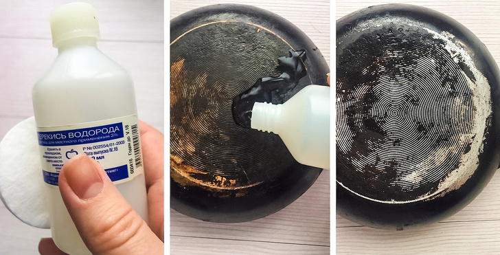 - Видаляє нагар. Очистити сковорідки від застарілого жиру і нагару допоможе паста з соди та перекису. Нанесіть її на забруднення і трохи почекайте, потім змийте водою.