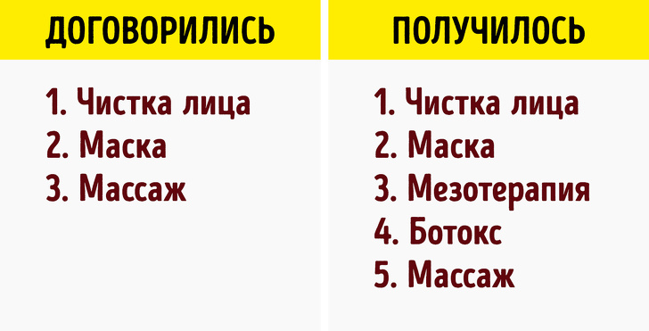 Якщо косметолог з порога починає нав'язувати вам уколи ботокса або кислотний пілінг, то варто задуматися. Грамотний фахівець не буде призначати купу препаратів і дорогих процедур, якщо у вас немає видимих проблем зі шкірою. Мета у косметолога повинна бути допомогти, а не заробити на ваших проблемах.