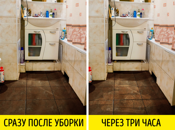 Багато залежить і від якості води. Чим вона жорсткіше, тим сильніше будуть помітні плями на підлозі, коли він висохне після миття. Сліди залишаться і на світлій плитці, але вони будуть менш помітні.