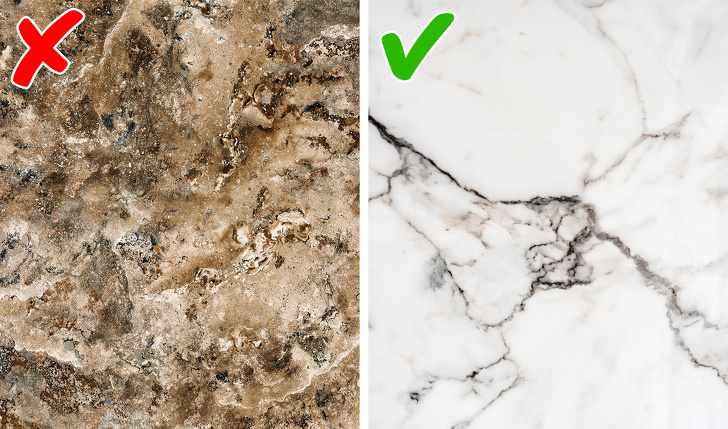 Покриття під натуральний камінь виглядає красиво і дорого. Одним з його плюсів називають здатність маскувати забруднення. Але у цьому є і мінус: дрібне сміття легко не помітити, переплутавши з візерунком, або, навпаки, можна довго відтирати пляма, яке насправді є частиною принта. Тому багато рекомендують зробити вибір на користь світлих текстур, наприклад, під мармур.