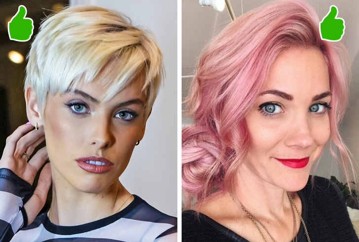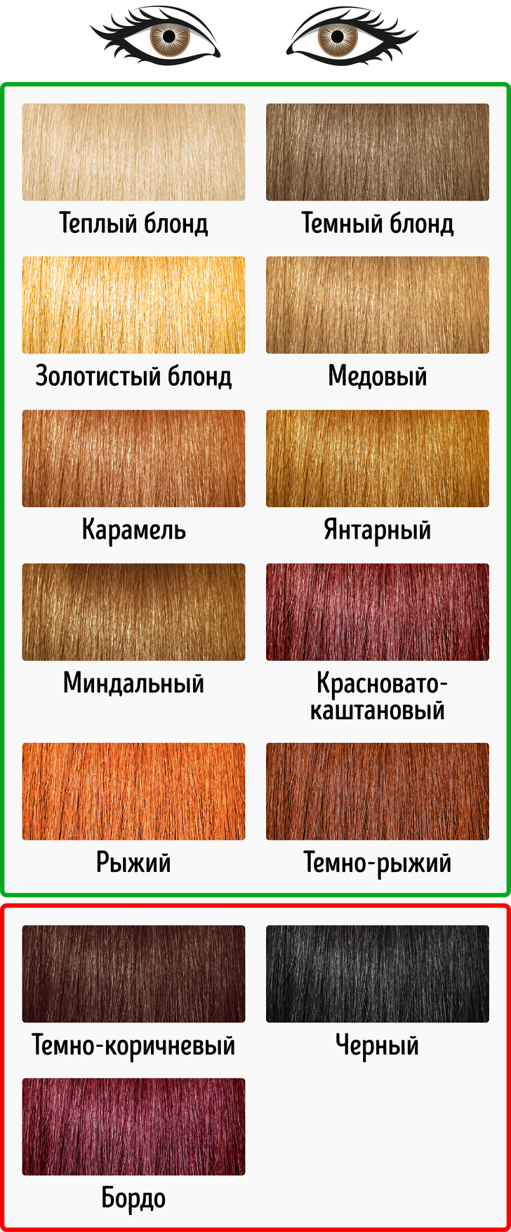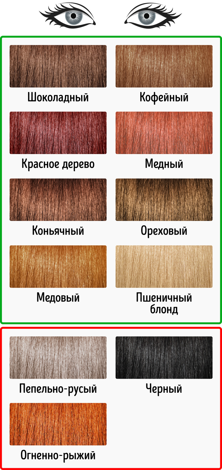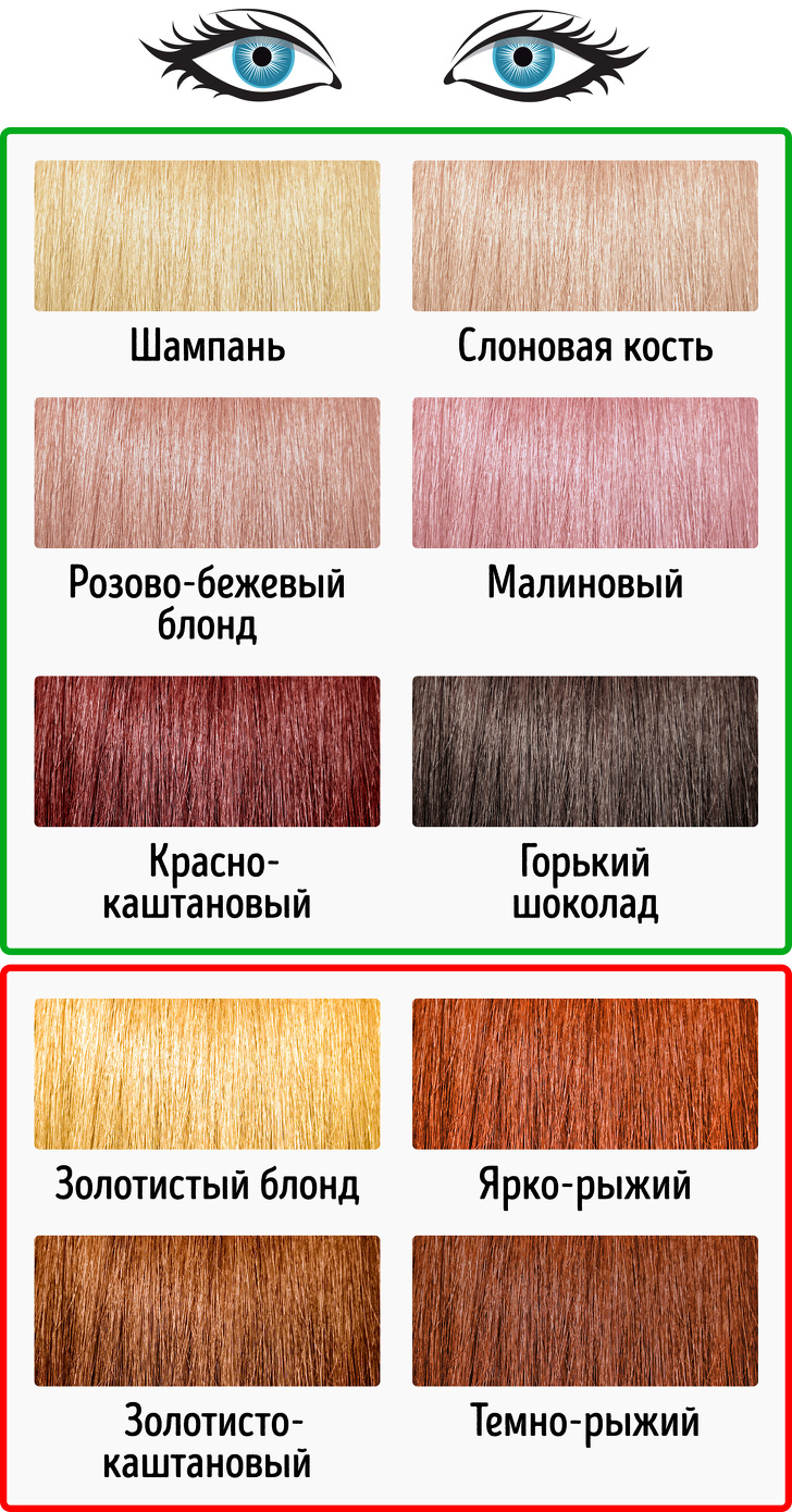 Блакитні очі стануть більш виразними в поєднанні з холодними відтінками блонда, такими як шампань, слонова кістка, рожево-бежевий блонд, вважає відомий колорист Бет Мінарді (Beth Minardi). Молодим жінкам з рівною шкірою, без мішків під очима підійдуть вишневий і бордо.