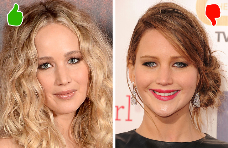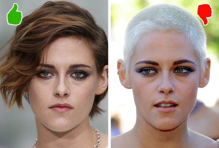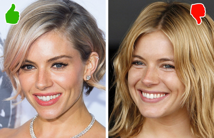 А ось теплі відтінки блонда, рудий, золотисті тони краще не застосовувати: вони працюють на спрощення образу. І тим самим перетворюють світську красуню в сільську дівчину, як у прикладі з Сієнною Міллер.