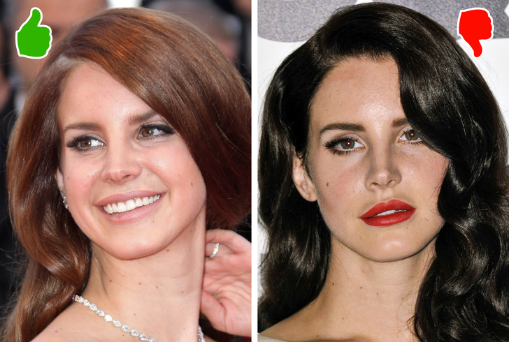 Людям з карими очима треба триматися золотої середини і не кидатися в крайнощі, вважає Бет Мінарді. Адже занадто світлі, як і занадто темні тони борються з природним пігментом очей і надають рисам особи неприємну різкість. Саме з цієї причини образ Лани Дель Рей з радикально чорними волоссям нам не здається найбільш вдалим.