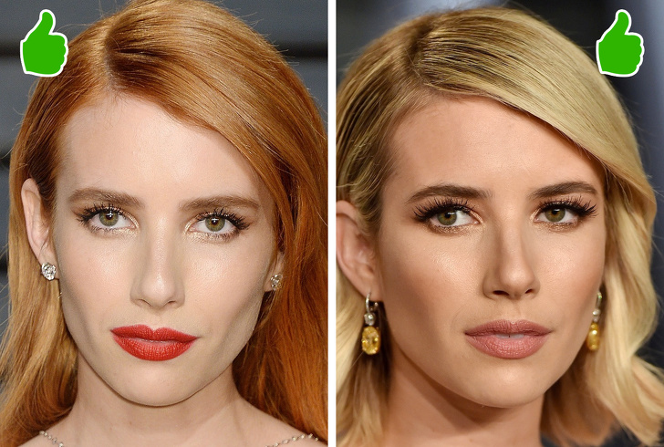 З карими очима добре поєднується червонувато-каштановий колір волосся, а також будь-які теплі сонячні відтінки: золотистий блонд, медовий, бурштиновий, рудий, мідний, карамель, мигдальний. Погляньте на цих знімках Емма Робертс і з бурштиновим відтінком, і з теплим блондом виглядає чудово.