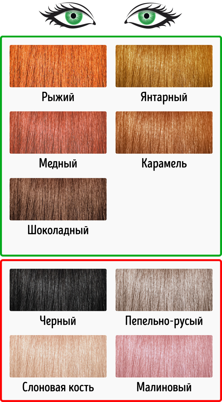 Чисто зелений колір очей зустрічається у людей вкрай рідко, і, ймовірно, тому такі очі нам здаються самими красивими. Кращим доповненням до них стануть руді, бурштинові, карамельні і шоколадні відтінки волосся. Теплі кольори підкреслять приємні зелені тони і зроблять погляд більш чуттєвим і глибоким.