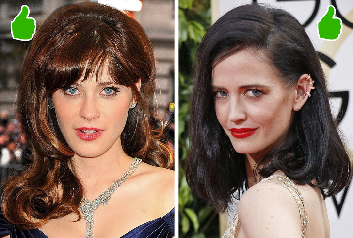 Для холодного відтінку блакитних очей Лоррі Годдар-Кларк додає до списку вдалих поєднань червоно-каштановий і гіркий шоколад. І найкращим доказом її слів служать фотографії Зоуі Дешанель і Єви Грін.