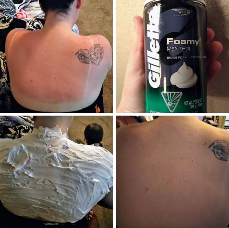 1. Ментолова піна для гоління — ефективний засіб від сонячних опіків. Нанесіть велика кількість піни на шкіру (не втирати), залиште на 30 хвилин і потім змийте прохолодною водою. При необхідності повторіть (не використовувати при відкритих ранах)