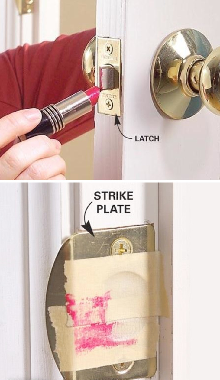 4. Злегка промажте засувку помадою і заклейте запірну планку папером, щоб зрозуміти, наскільки сильно просіла двері