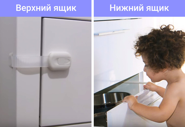 Забезпечте заглушками верхні ящики комодів або кухонних шафок, а нижні можна віддати на поталу дитині.