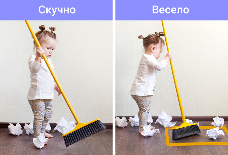 Часто дитині важко тримати одночасно щітку і совок, і він починає нервувати. Зробіть на підлозі одну або кілька фігур з липкої стрічки (квадрат, трикутник) і попросіть малюка замітати сміття всередину фігури. А вже звідти самі помітите його на совок. У фігури також можна просити збирати певні іграшки, деталі конструктора, кубики.