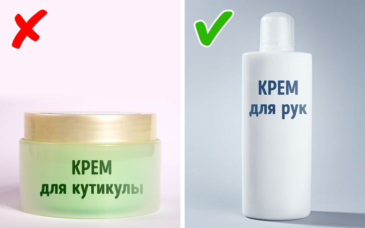 Найчастіше складу крему для кутикули мало чим відрізняється від складу звичайного крему — це просто ще один спосіб змусити людей купувати більше. Щоб не переплачувати за красиву баночку, для догляду за кутикулою використовуйте масла або звичайні живильні креми.