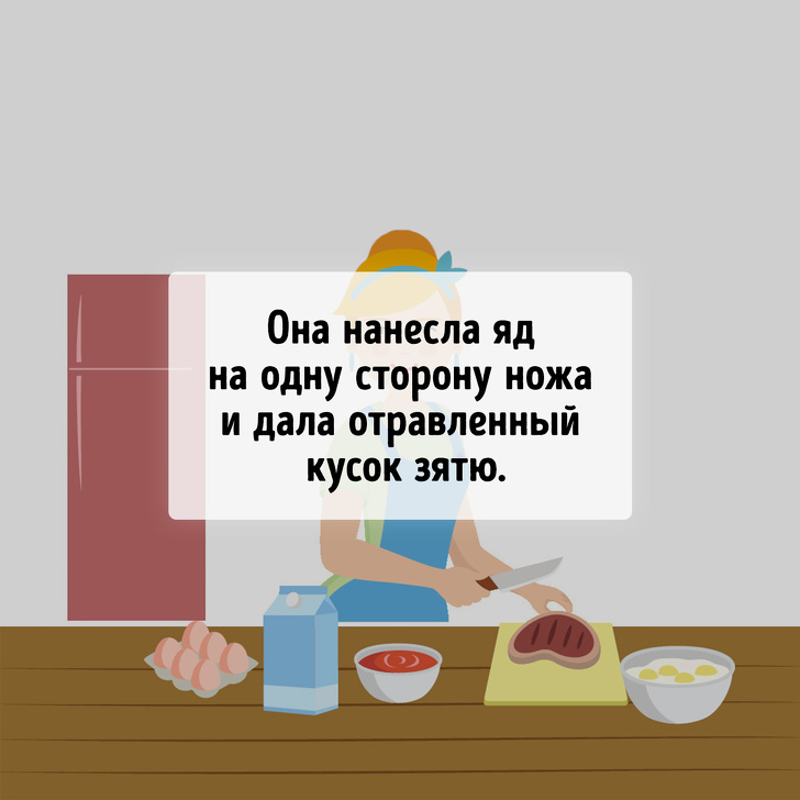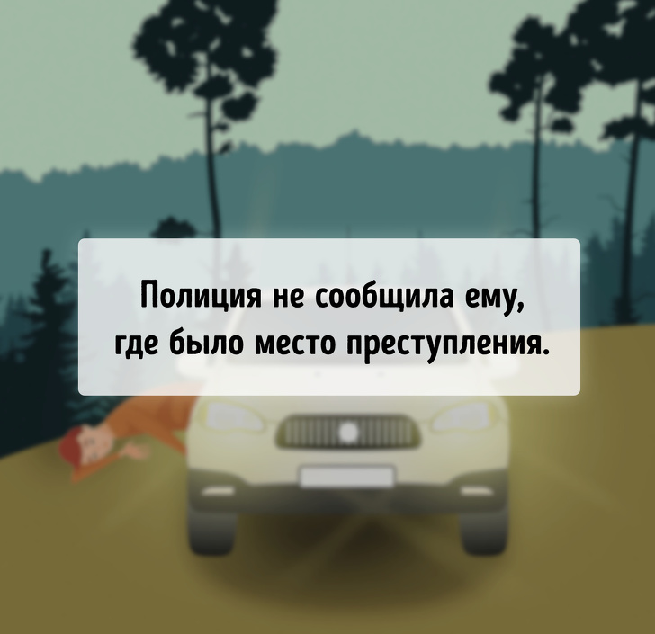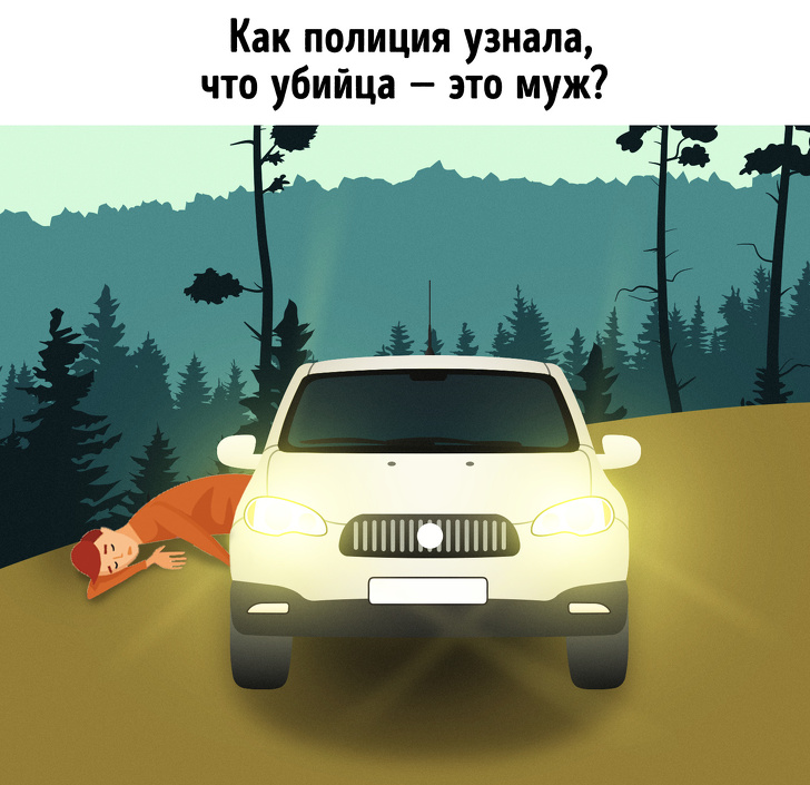 Чоловік зарізав свою дружину і, оскільки свідків не було, залишив її тіло на землі, кинувши закривавлений ніж у лісі. Потім він сів у машину і поїхав в офіс. Через годину поліція зателефонувала йому, щоб повідомити про вбивство. Вони попросили його негайно приїхати на місце злочину. Коли він туди добрався, його відразу ж заарештували.
