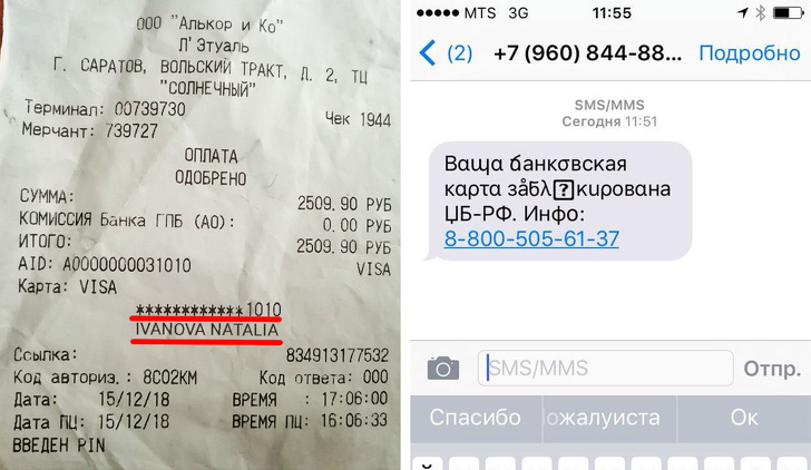 Якщо товар був оплачений карткою, то на чеку будуть надруковані персональні дані про покупця: ім'я, прізвище та останні чотири цифри номера карти. З такими даними шахрай може розшукати власника в соцмережах і з'ясувати його номер телефону (багато вказують на сторінці свого облікового запису). Далі шахрай відправляє на цей номер повідомлення нібито від банку про те, що картка заблокована і потрібно відправити код. Не всі звертають увагу на підозрілий номер «банку», тому легко можуть піддатися на гачок аферистів.