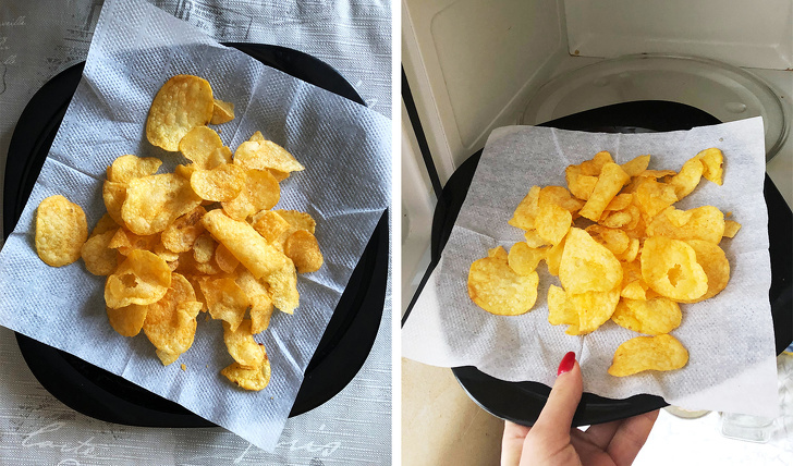 - Можна накрити зверху ще однією серветкою. Тепер відправте снеки в мікрохвильову піч на 30 секунд. Вуаля — чіпси і сухарики знову хрумтять!