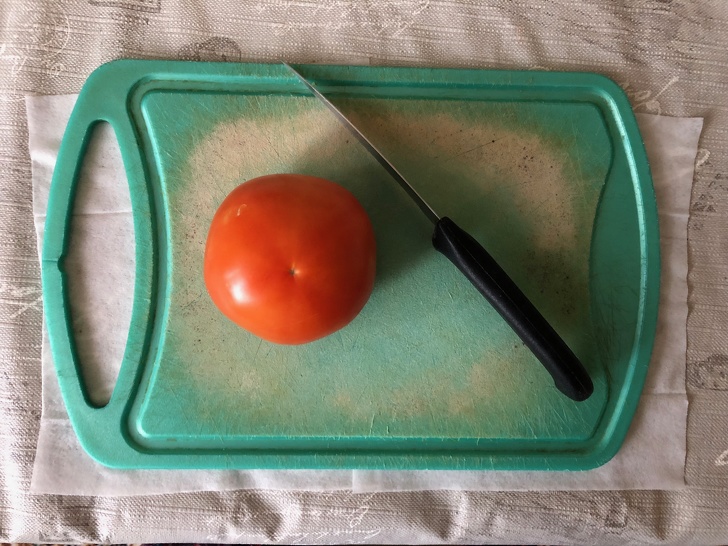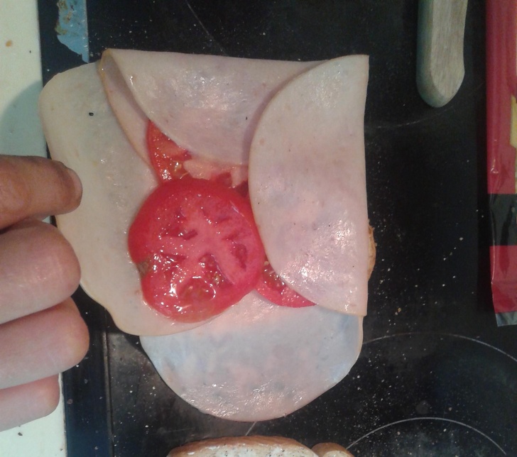 Для цього способу важливо вибрати шинку тонший, щоб легко можна було загорнути всередину помідори. Так вони не будуть сповзати з хліба.
