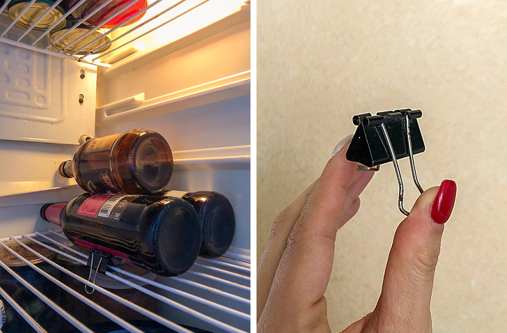 Використовуйте канцелярський затискач, щоб зафіксувати в холодильнику пляшки в горизонтальному положенні.