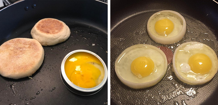 Знадобиться обмежувальне кільце від скляної банки. Помістіть його на сковороду і розбийте всередину яйце. Тепер воно не буде розповзатися по всій сковороді. Не забудьте акуратно видалити кільце.