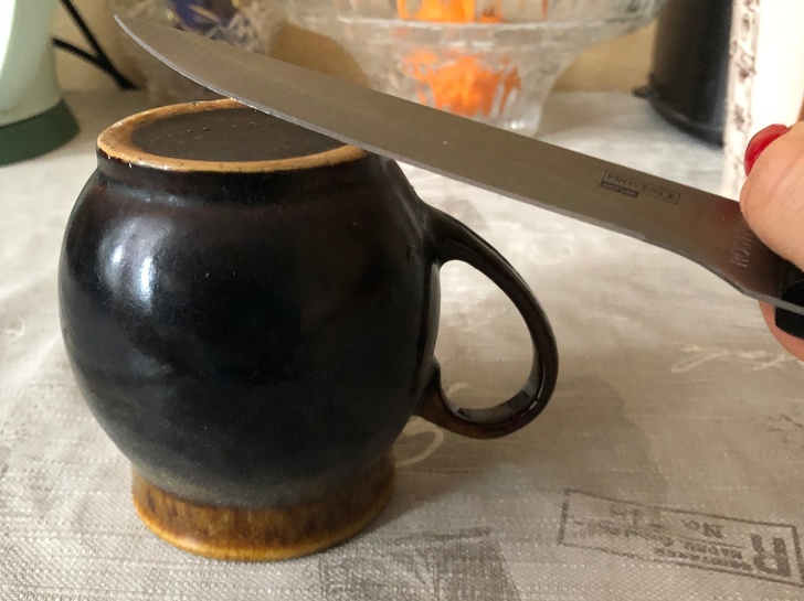Якщо під рукою немає відповідного приладу для заточування, як екстреного варіанта підійде звичайна керамічна чашка. Переверніть її і проведіть ножем кілька разів по денця.
