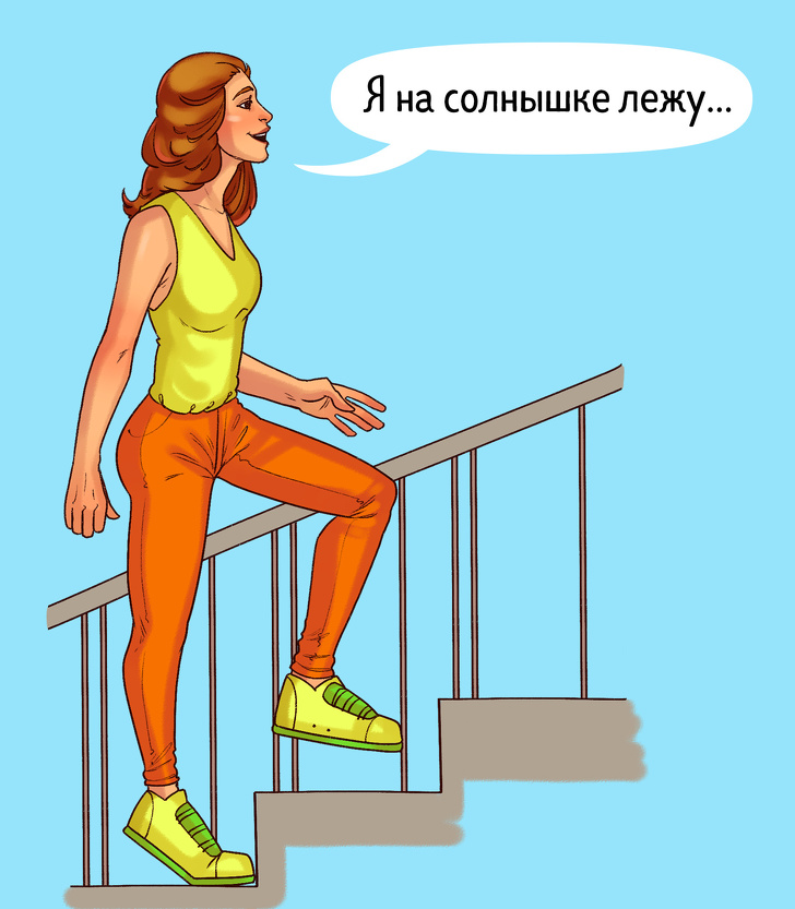 Щоб пройти цей тест, вам доведеться вийти з дому. Підніміться по сходовому прольоту (8-12 ступенів), наспівуючи пісеньку. Можна розмовляти по телефону або читати вірш. Головне — не мовчати. Якщо серце вистрибує з грудей, а подих збивається, то серцево-судинна система і легені не справляються з навантаженням.
