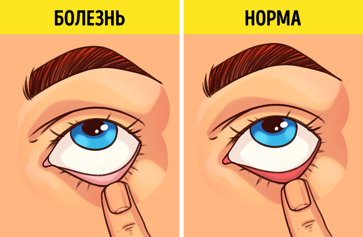 Стоячи перед дзеркалом, відтягніть нижню повіку. В нормі його колір яскраво-рожевий. Однак при анемії внутрішнє віко приймає блідо-рожевий або навіть жовтуватий відтінок. Анемія виникає від нестачі гемоглобіну. М'язи і тканини організму одержують мало кисню і не можуть працювати на всі 100 %. Якщо ви помітили у себе блідість, підвищену стомлюваність або задишку, то краще здати аналізи і визначити рівень заліза в крові.