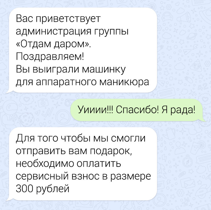 Шахрай може представитися адміністратором групи «Віддам даром» і попросить перерахувати невеликий внесок, щоб підтвердити намір забрати приз. І, природно, його повернуть разом з подарунком. Нібито такі правила співтовариства, а за відсутність внеску штрафують адміністраторів.
