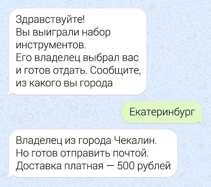Але от невдача: приз знаходиться в іншому місті, а платна доставка в плани не входила. А що таке 400 рублів у порівнянні з iPhone XS, який вже лежить на пошті? Суща дрібниця! Ось тільки після оплати «доставки», шахрай перестає відповідати на повідомлення або просто видаляє сторінку.
