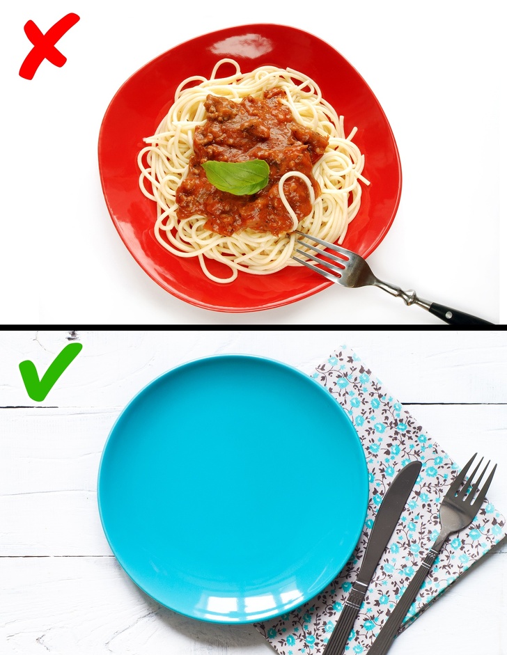 Дослідження показало, що люди з'їдають менше з тарілок, які виглядають контрастно по відношенню до їжі. Також вчені встановили, що люди з'їдають на 33 % менше у кімнаті, оформленої в блакитних тонах.