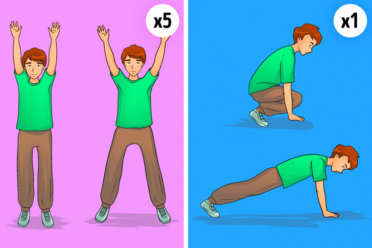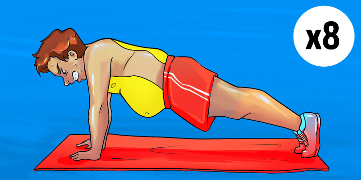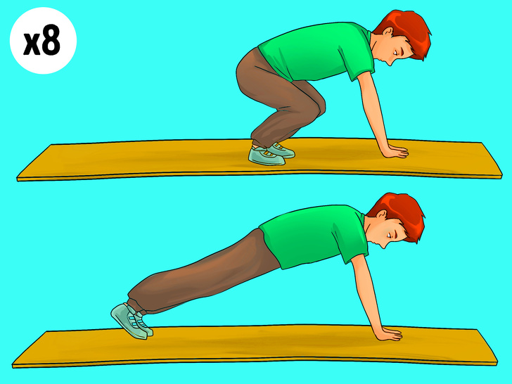 Виконуйте ці вправи з часовими інтервалами: «СТАРТ» (20 секунд) і «СТОП» (10 секунд). Для кожної вправи зробіть по 8 підходів. Потім влаштуйте хвилинну перерву і переходите до наступної вправи.
