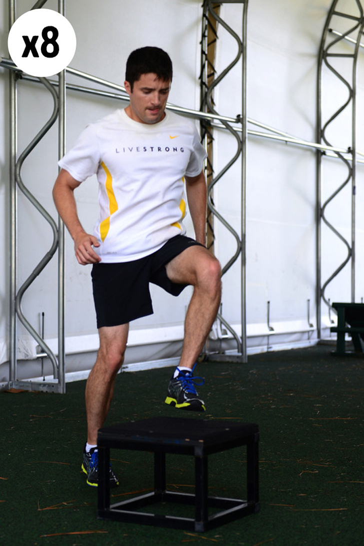 Для виконання «вибухових» підйомів вам знадобиться невисокий стілець. Поставте одну ногу на стілець, обіпріться на неї і підстрибніть. Під час стрибка поміняйте ногу так, щоб тепер інша опинилася на стільці. Зробіть 8 підходів.
