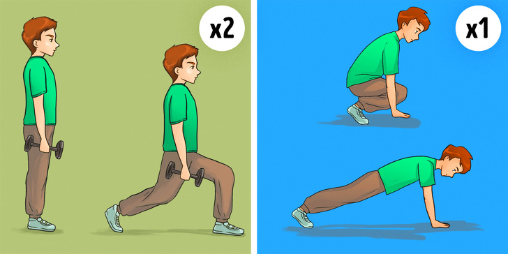 Встаньте прямо, підстрибніть і приземлитеся в положення випаду. Слідкуйте за тим, щоб переднє коліно не виступало за пальці ноги. Потім підстрибніть і поміняйте передню і задню ноги місцями. Повторіть двічі і переходьте до берпи.