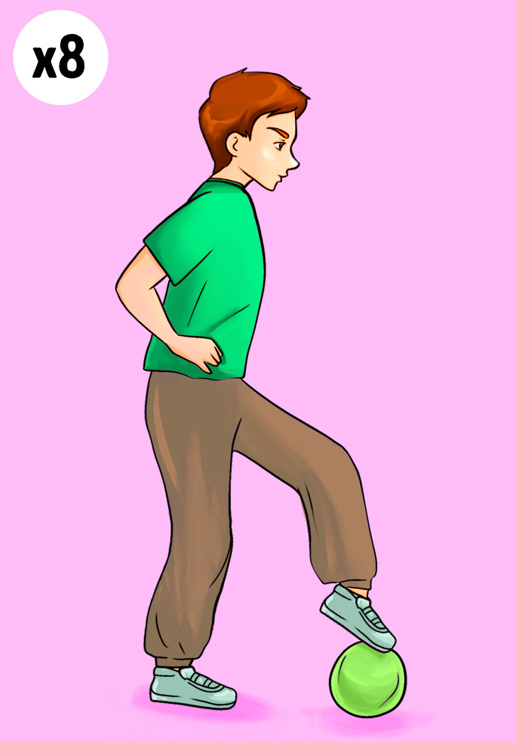 Для цієї вправи знадобиться м'яч. Поставте пальці ноги на м'яч, підстрибніть і почніть чергувати ноги, постукуючи то однієї, то іншої по м'ячу.