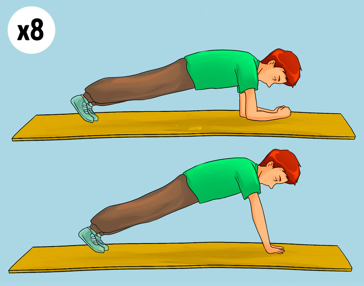 Упріться пальцями і долонями в підлогу. Тримаючи лікті близько до тіла, опускайте корпус до підлоги так, щоб лікті згиналися під кутом 90 градусів. Підніміть корпус, відштовхнувшись від підлоги. Повторіть 8 разів.