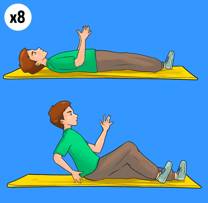 Ляжте на спину. Підніміть передпліччя вгору під прямим кутом до корпусу. Потім потягніться зігнутим ліктем до протилежної нозі, одночасно зігнувши ту у коліні. Повторіть.