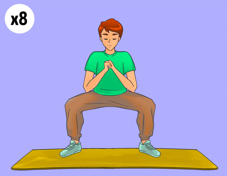 Розставте ноги ширше плечей і розгорніть їх під кутом 45 градусів. Тепер виконайте присідання під кутом 90 градусів, але опустіться тільки наполовину, а потім знову распрямитесь.